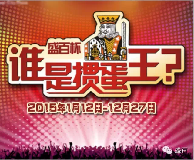 主办单位:桐城市体育局、桐城市总工会 承办单位:安徽省盛源投资集团 赞助单位:桐城市思桐商贸有限公司 桐城市帝元商贸有限公司 桐城市丰润酒业有限公司 报名时间:2015年1月12日 - 2015年12月27日 比赛时间:2015年1月31日 - 2015年12月27日每周六、日 13:00-20:00。(国家法定节假日除外 比赛场地:盛百二楼 参赛条件:不限年龄、不限性别 报名方式: 1. 报名咨询热线:15155602030(可发送短信报名) 2. 报名咨询QQ: 493127151 3. 关注盛百微信后,点击“盛百掼蛋大赛”报名 4. 在比赛时间内直接去往盛百比赛场地现场报名 比赛规则:参赛选手须抽号入座,每个座位上均贴有号码,选手按抽中的号码对应座位所示号码入座比赛。双关得3分,单关得2分,头名不关得一分,2个小时为一局,按局统计选手比分。 奖品设置: 周 排名:第一名:现金150元+盛百代金卡150元 第二名:价值约150元奖品 第三名:价值约100 元礼品 月 排名:第一名:现金500元+盛百代金卡500元 第二名:价值约500元奖品 第三名:价值约200元奖品 年 排名:第一名: 2000元+盛百代金卡2000元 第二名:1500元+盛百代金卡1500元 第三名:1000元+盛百代金卡1000元 注意事项:1. 所有参加比赛的选手均可获得盛百纪念奖一份。 2. 选手比分若有并列,双方以抽牌比大小分胜负。 3. 选手须登记正确的联系方式。 谁是掼蛋王??头脑风暴等你来挑战!!!