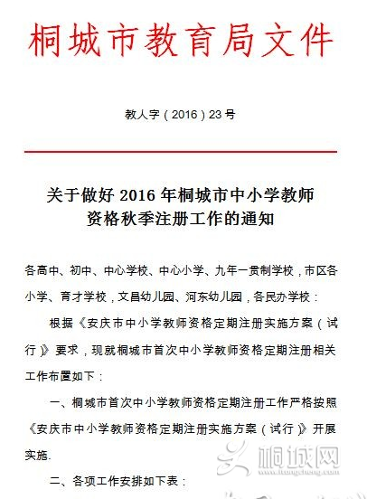 关于做好2016年桐城市中小学教师 资格秋季注册工作的通知
