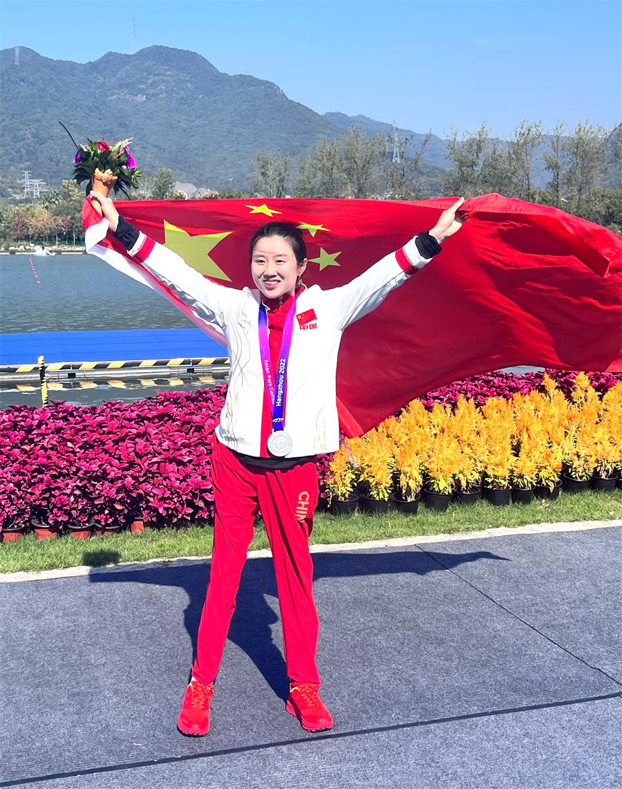 图为杭州第4届亚残运会皮划艇女子KL2级项目比赛颁奖仪式上的王珊珊。
