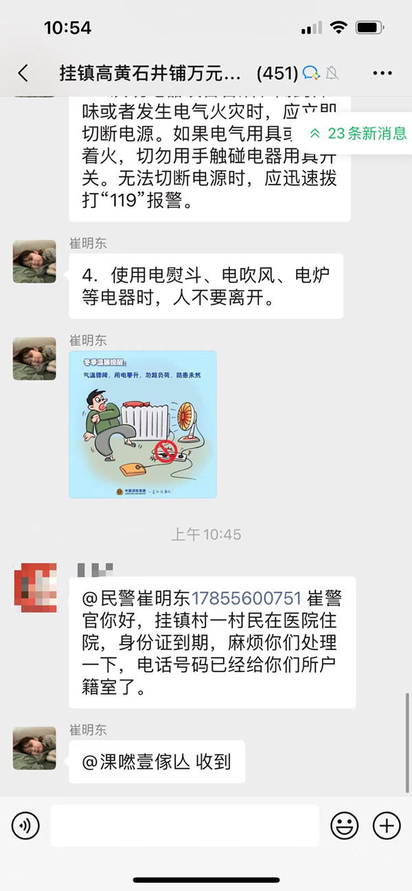 2023年1月18日上午,范岗派出所民警在警民议事厅微信群里,接到群众求助:挂镇村一村民姚某在荣军医院住院,因身份证到期,行动不便,无法到派出所户籍室办理身份证,请求帮助。民警了解情况后,立即联系姚某,与其约好时间开展上门办证服务。
